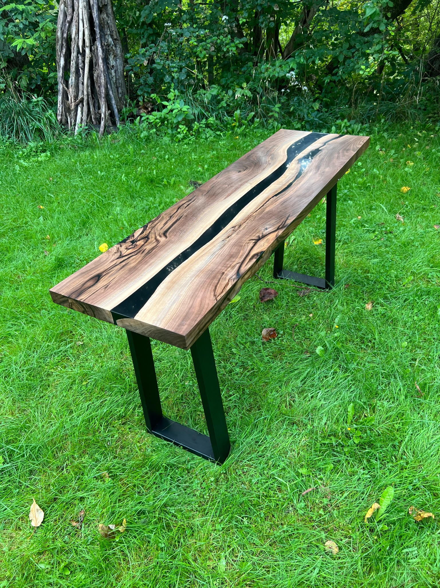 66″ x 18″ Black Walnuts Slabs + Black Epoxy River + U-Shaped Legs (Counter Height) – $1950 each.