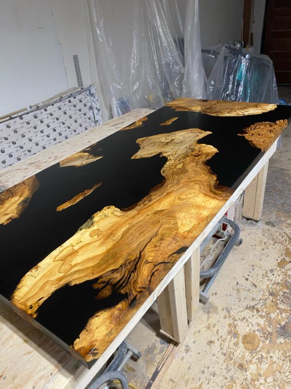 80″ x 36 – Maple Burl – Live edge Inner – Black Epoxy River. Looking for a custom dining room table? boardroom table? coffee table with a unique 1 of a kind look? Choose a slab, select an epoxy style and color, finalize a layout, choose a custom set of legs all made to order.