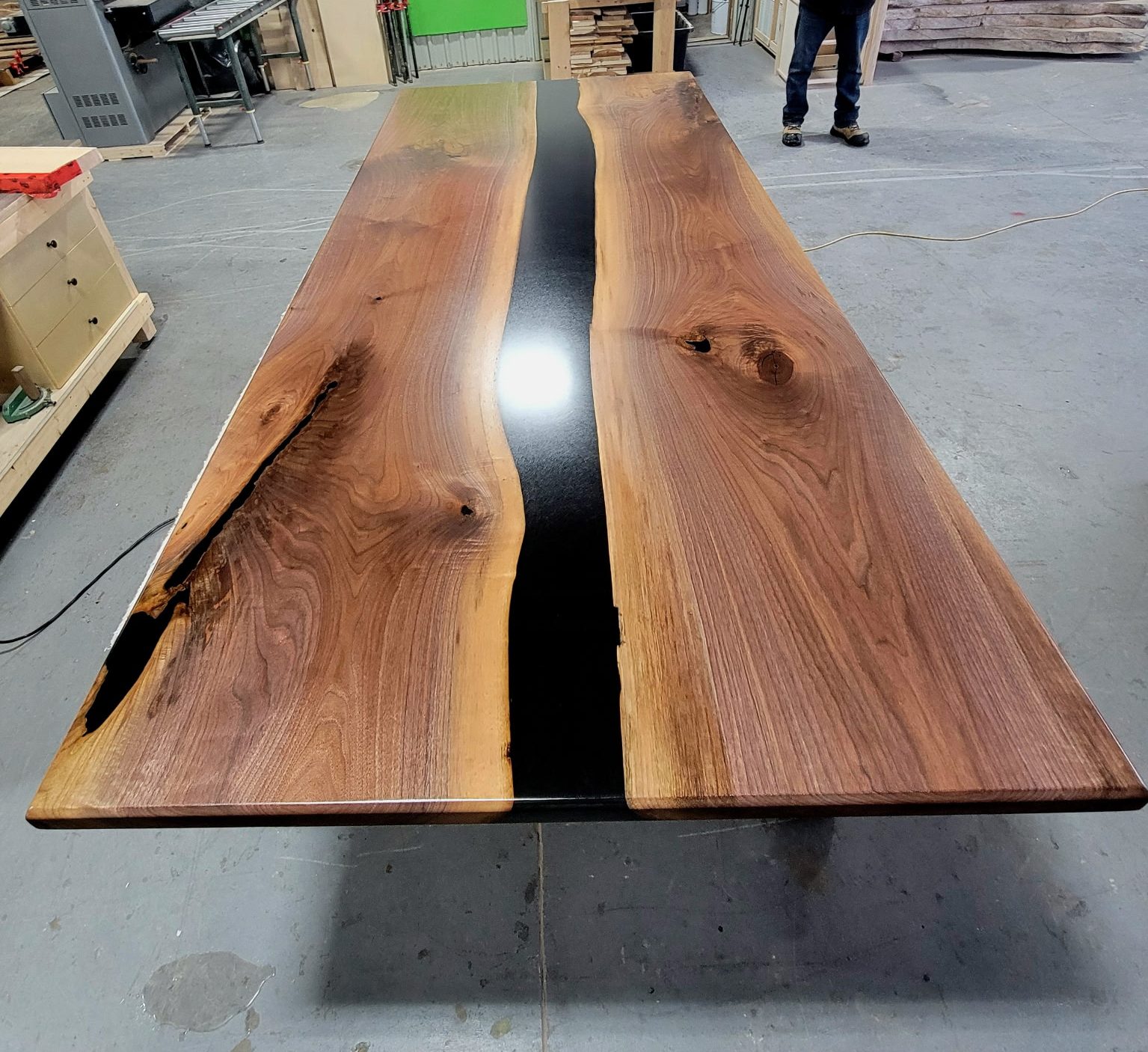 This beautiful custom build has been completed and delivered. Beautiful 9ft black walnut slabs with a epoxy highlights, also includes a full length black epoxy river. Finished with Rubio protective coat and a pair of very solid steel U-Shaped legs. Get a quote today for the size you need.